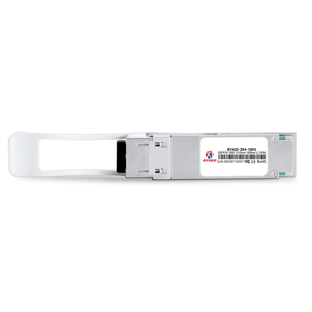 Cisco Compatible 100GBASE-ZR4 QSFP28 1310nm 100km optical transceiver module allows for 100 Gigabit Ethernet communication over a single-mode fiber optic cable with duplex LC connectors, at a wavelength of 1310 nm and up to 100 km in distance. It transmits across four multiplexed wavelengths internally managed for throughput.