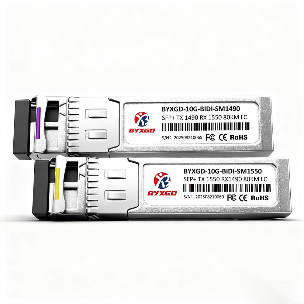 SFP-10G-BX80-U is a protocol-independent SFP+ BiDi transceiver for 10GBASE-BX80-U networks. The module uses a simplex LC connector and operates on OS2 SMF, with an operational distance of 80 km. This BiDi transceiver transmits on one wavelength, at 1490 nm, which serves as the transmit wavelength, and receives on another wavelength, at 1550 nm, with a complementary wavelength pairing for the opposite direction. DIAGNOSTICS: uses I2C (SFF-8472) to provide real-time parameters. TESTED: each transceiver is tested for compatibility with switches, routers, servers, NICs, and other network/LAN devices. POWER: consumes low power, optimized for long-distance links, suited for low-energy links. APPLICATIONS: enterprise, wiring closets, dark fiber service provider transport, Radio & Baseband Units, NICs, campus interconnects.