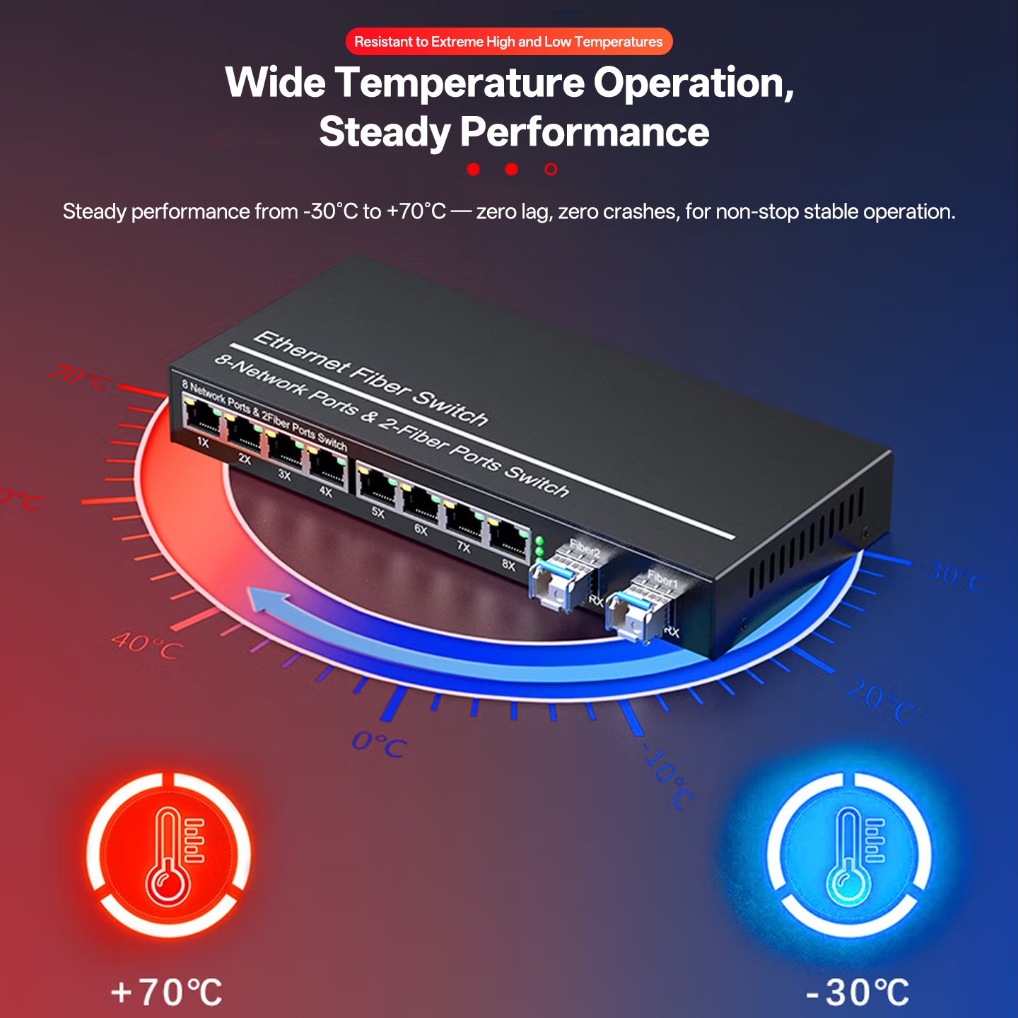 The converter is powered by high-performance switching chipsets, providing gigabit backplane bandwidth of 20Gbps and packet forwarding at 14.9Mpps, enabling fast and reliable network connectivity even under heavy utilization. The converter is constructed with a full metal aluminum housing and features a sophisticated design for convection heat dissipation to prevent performance degradation during long-term operation. With a broad temperature range from -30°C to +70°C, it allows for installation in harsh locations such as outdoor cabinets and industrial facilities.