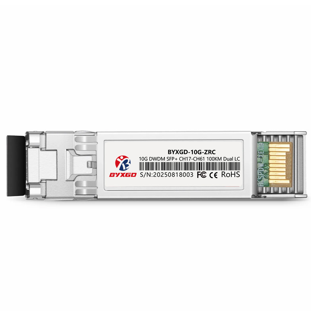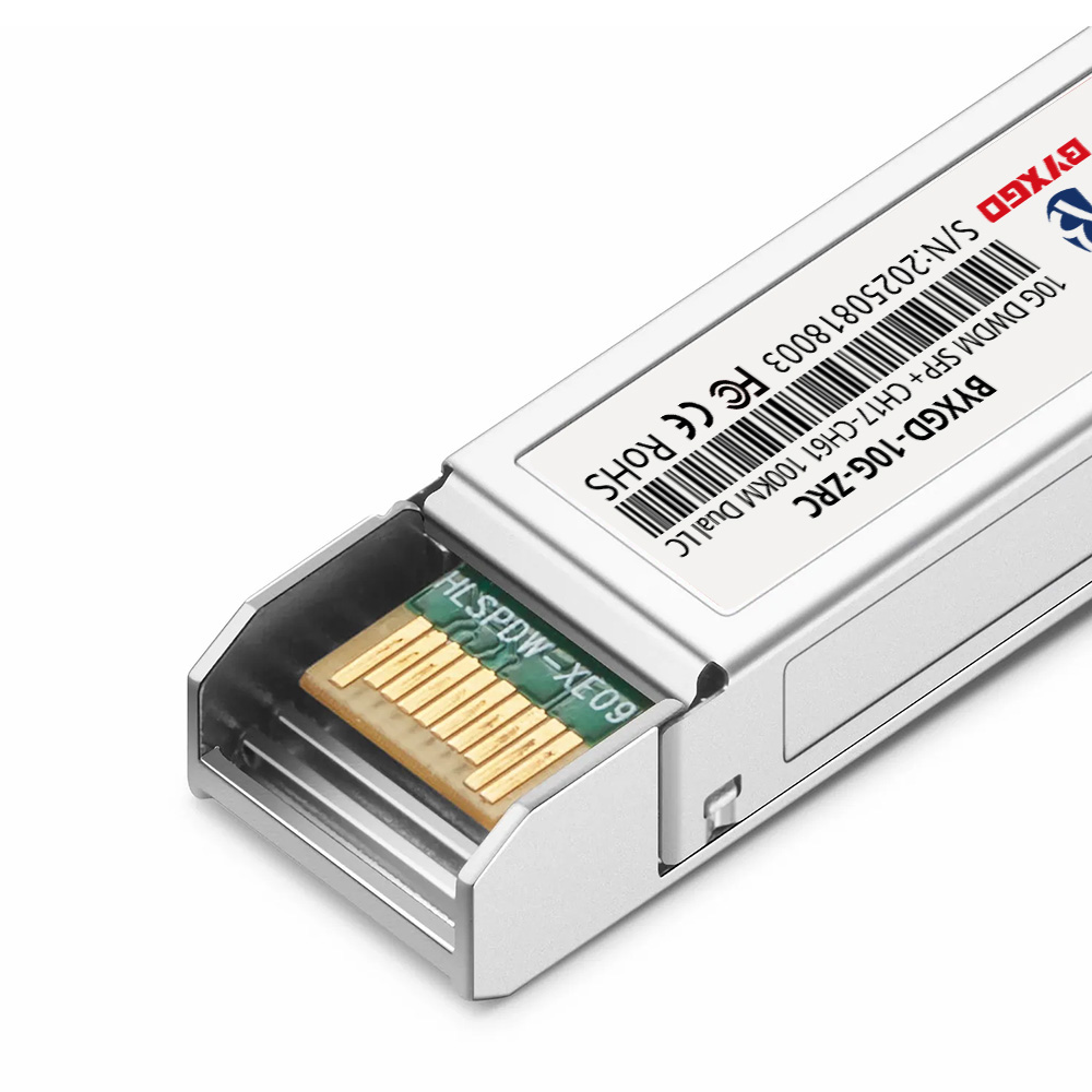 C17-C61 10G DWDM SFP+ 100GHz BYXGD transceiver supports speeds from 9.95-11.32 Gbps (10G Ethernet, STM-64, ODU2, ODU2e, OTU2, OTU1f, OTU2f, OTU1e, and OTU2e) using an EML laser transmitter at ITU-T 100 GHz (C-band) channels 17-61, with an APD photodiode receiver and duplex LC connector. With a minimum optical budget of 26 dB, the transceiver supports transmission of up to 100 km using single-mode fiber (SMF). Data can be monitored via SFF-8472 DDM in real-time; the parameters monitored include voltage, bias current, temperature, and TX and RX power. The device is hot-pluggable SFP+ and complies with SFF-8419 MSA and IEEE 802.3ae 10GBASE-ZR. It has an operational temperature range of 0-70 °C. CE/RoHS certifications are provided, and the EEPROM has been factory-tested on DWDM switches and routers. This part number is a third-party compatible version of SFP-10G-DWDM-EZR-xx.xx. The device requires a DWDM multiplexer/demultiplexer (Mux/Demux) to operate and is compatible with customized DWDM systems, working across major platforms.
