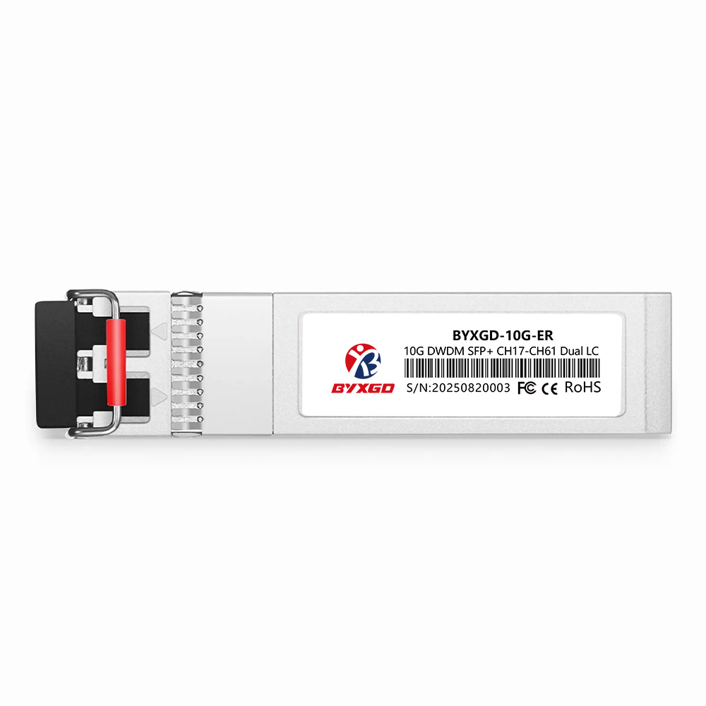 BYXGD C17-C61 10G DWDM SFP+ optical transceiver modules that operate using 100 GHz DWDM technology are compatible with the Cisco DWDM – SFP10G – 40 Series and other products manufactured by Arista (10G SFP+). They have been developed to support 40 km DWDM links utilizing G.652 and G.655 single-mode fiber optic cable and use an EML transmitter and a PIN photodiode receiver.