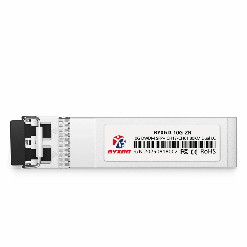 BYXGD SFP-10G-DWDM-ZR is a 10G DWDM SFP+ transceiver that operates within a C17-C61 ITU-T 100 GHz grid and supports a maximum line rate of 10.5 Gb/s and a reach of 80 km on G.652/655 (single-mode) fiber via a duplex LC/UPC interface. The device employs an EML transmitter with an APD receiver and has a 24 dB optical power budget to work with DWDM channels ranging from 1528.77-1563.86 nm for long-distance (ZR) links. Users can monitor the SFP-10G-DWDM-ZR module using Digital Diagnostic Monitoring (DDM/DOM) via a 2-wire interface, providing real-time information on module temperature, supply voltages, bias currents, and optical output powers. Compliance with SFP+ MSA, SFF-8431, SFF-8432, SFF-8472, IEEE 802.3ae, and RoHS is established for the SFP-10G-DWDM-ZR; the device can be replaced without powering down related systems, with a nominal power draw below 1.6 watts.