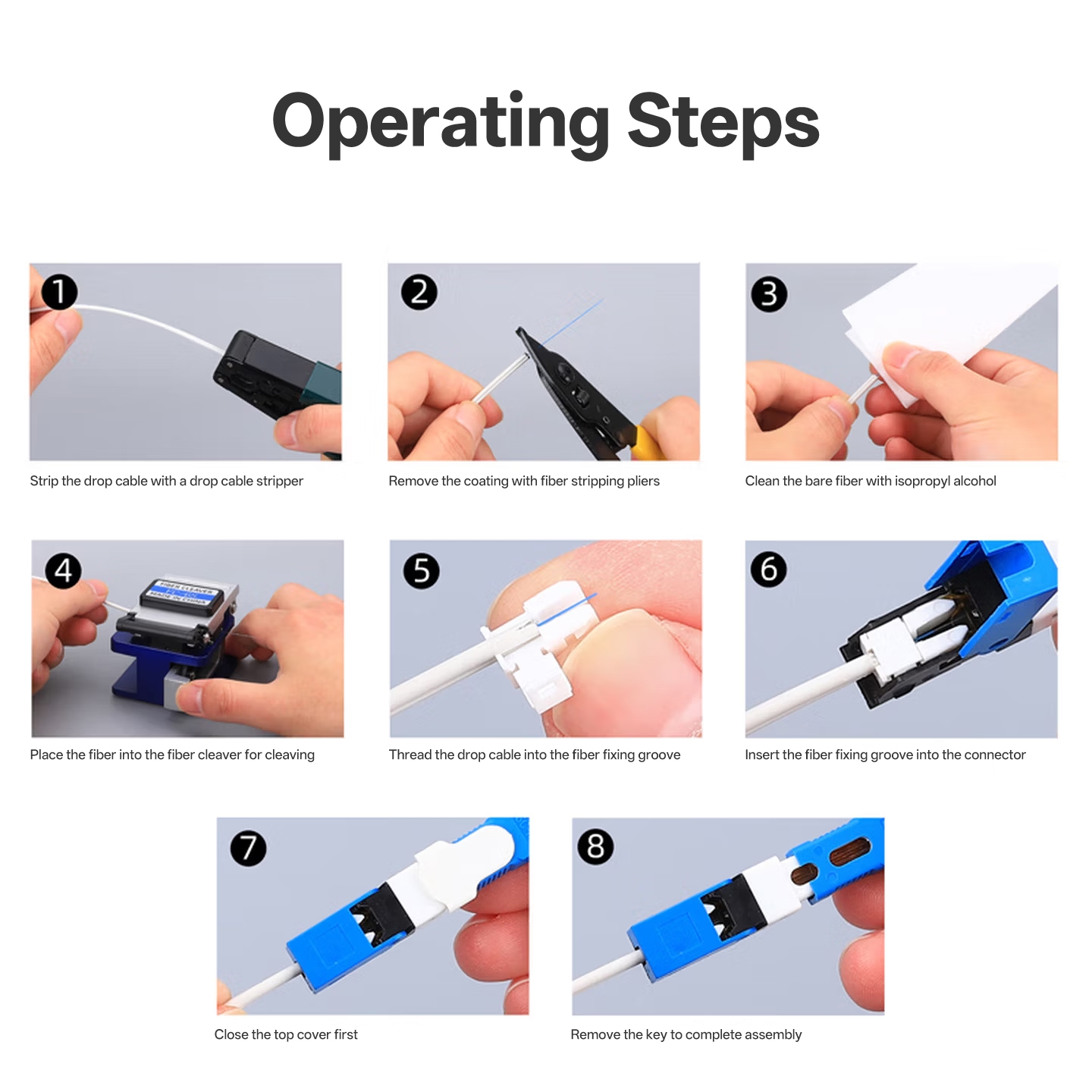 The ESC250D was designed specifically to allow for quick and easy fiber termination in the field using traditional FTTH tools. The following assembly steps are required: