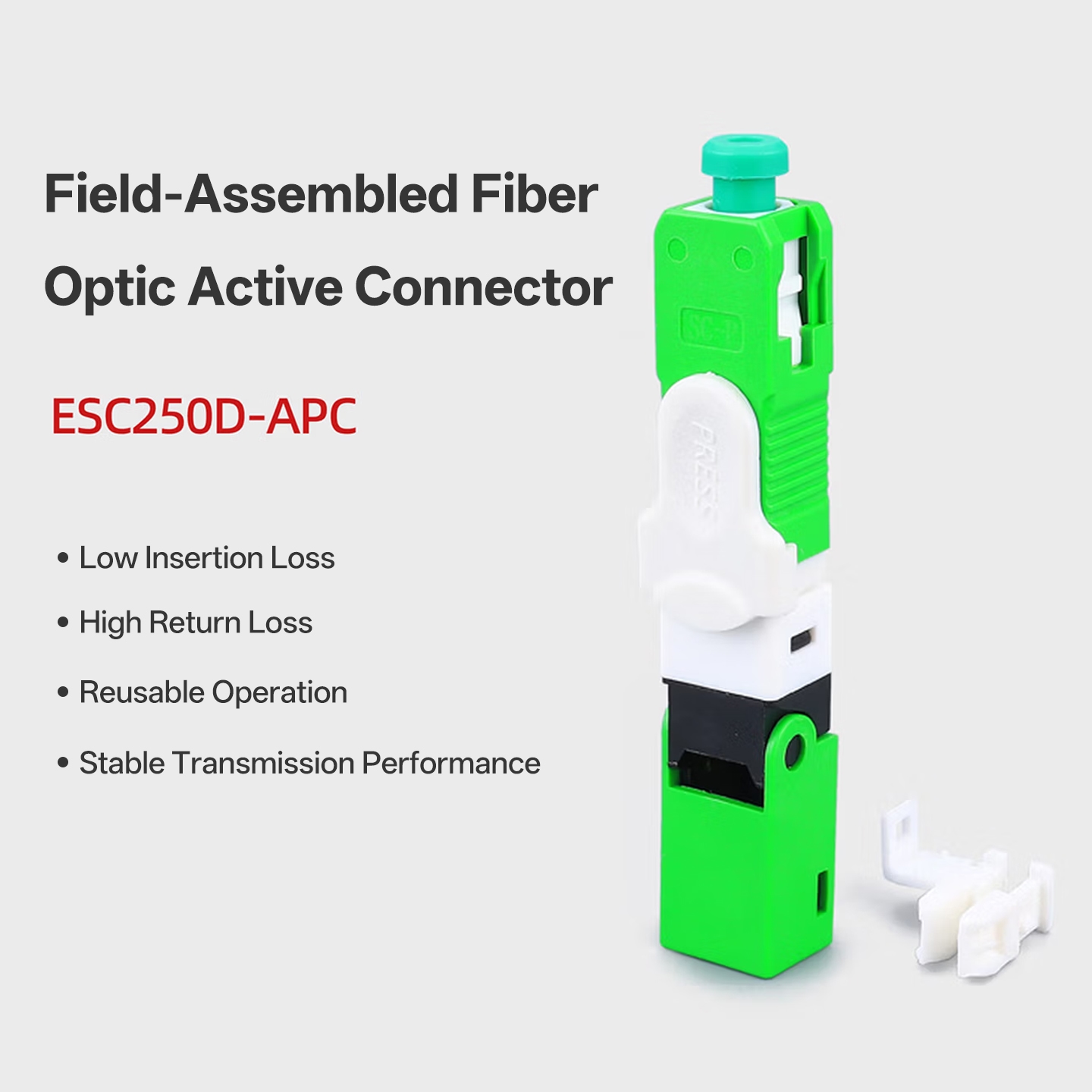 Designed for fast, accurate, and dependable optical fiber terminations, the ESC250D Fiber Optic Fast Connector is an environmentally friendly, field-installable optical connector suitable for FTTH and LAN networks. It is available in SC-APC and SC-UPC versions. This connector provides a simple and efficient way for installers to terminate fiber optics onsite without the need for a fusion splicer. The ESC250D eliminates hours of installation labor while providing reliable optical performance over time.