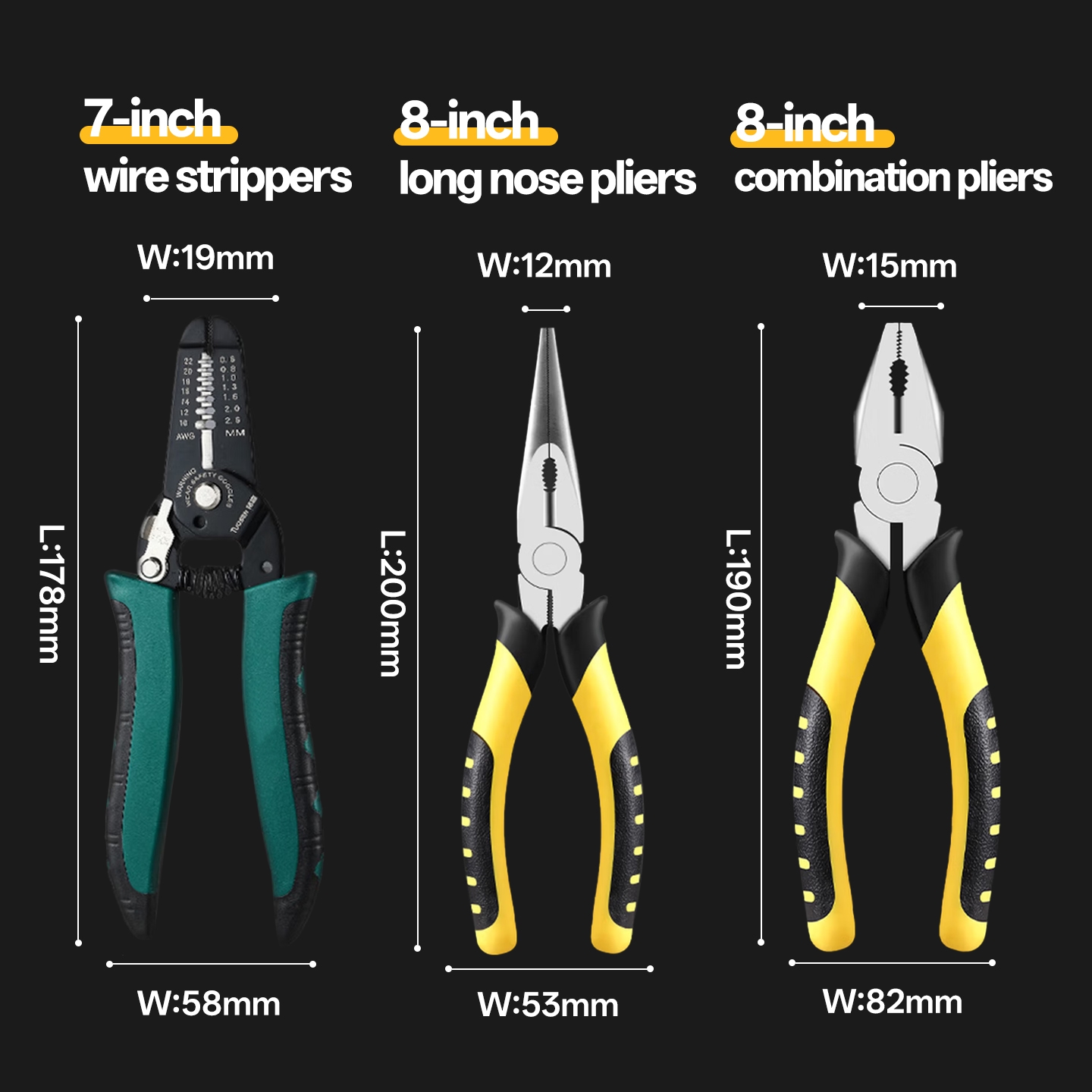 | 8″ Lineman’s Pliers | 190mm | 82mm | 15mm |