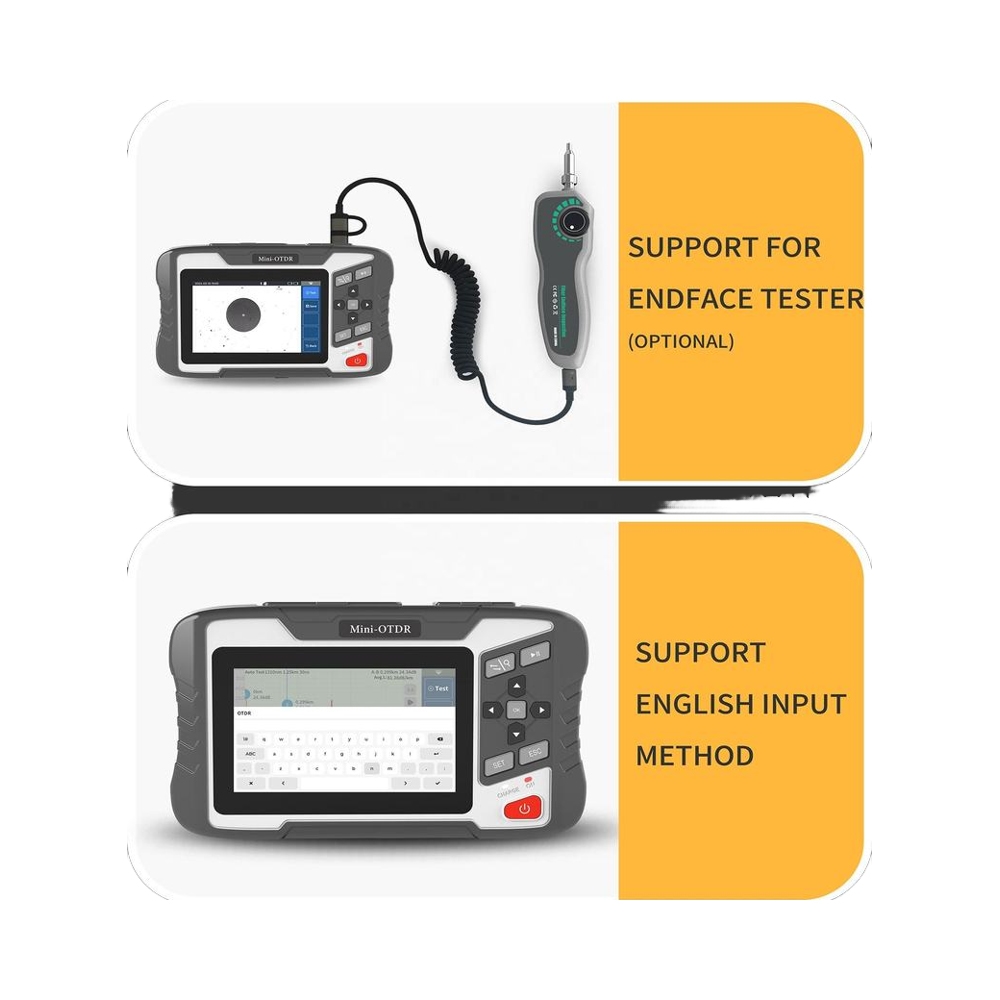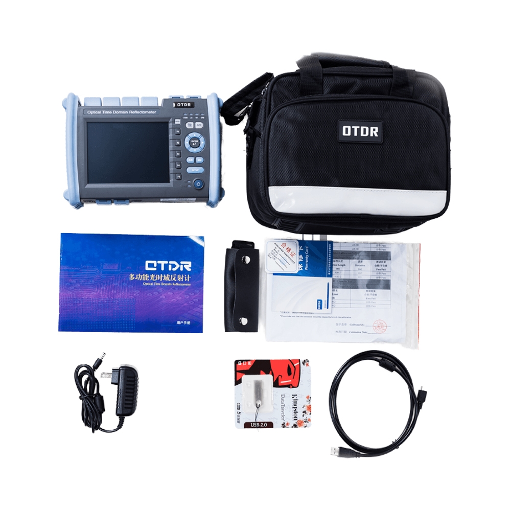 Included with every model is a standard accessory package that consists of the following items: host device with battery, AC power supply, data communication cable, an 8 GB MicroSD (TF) card that includes preinstalled analysis software and instruction manual, a printed copy of the operator’s manual, SC adapter (interchangeable with FC), RJ45 ethernet tracer and remote, test report, certificate / warranty card (2-year), cleaning swabs, and a carry bag.
