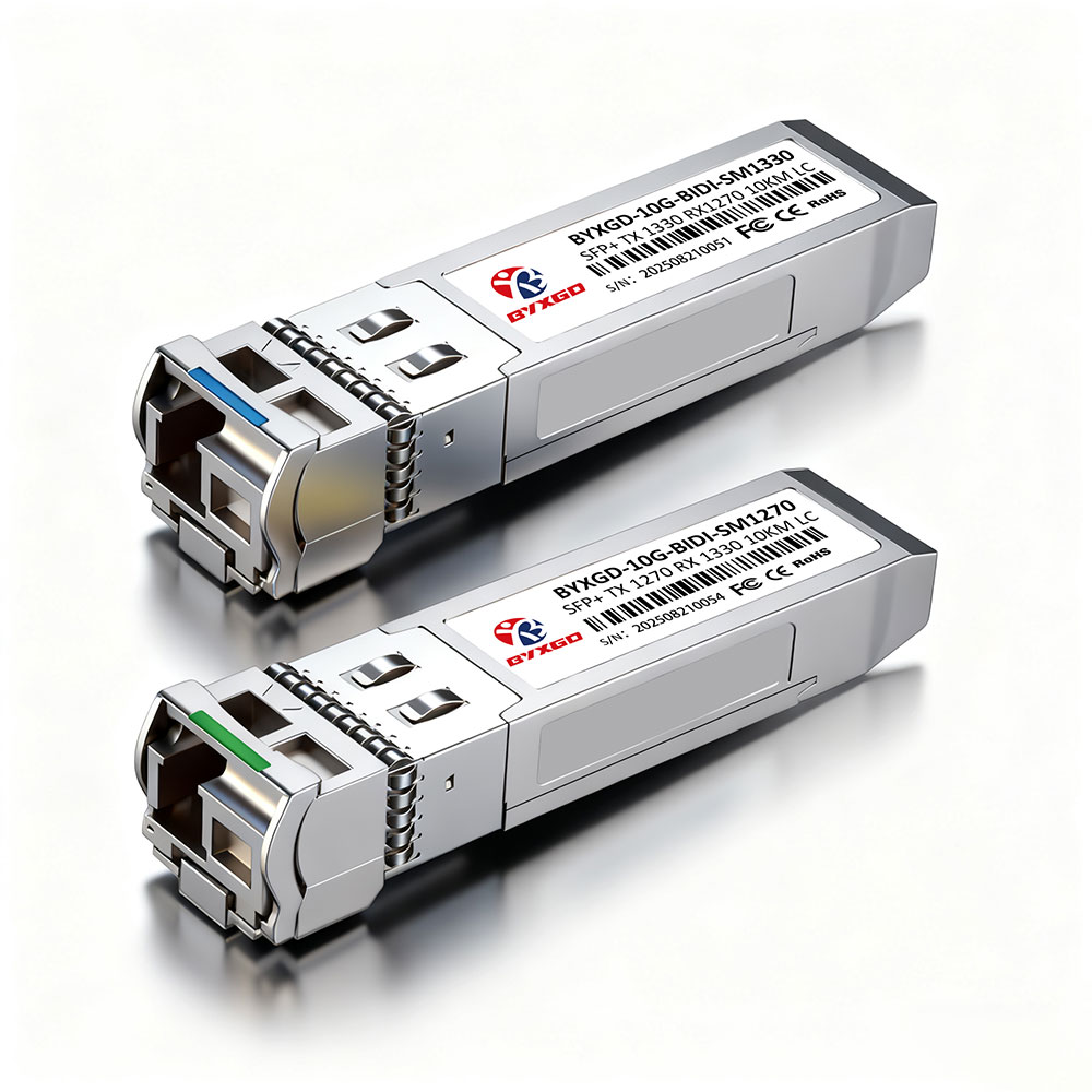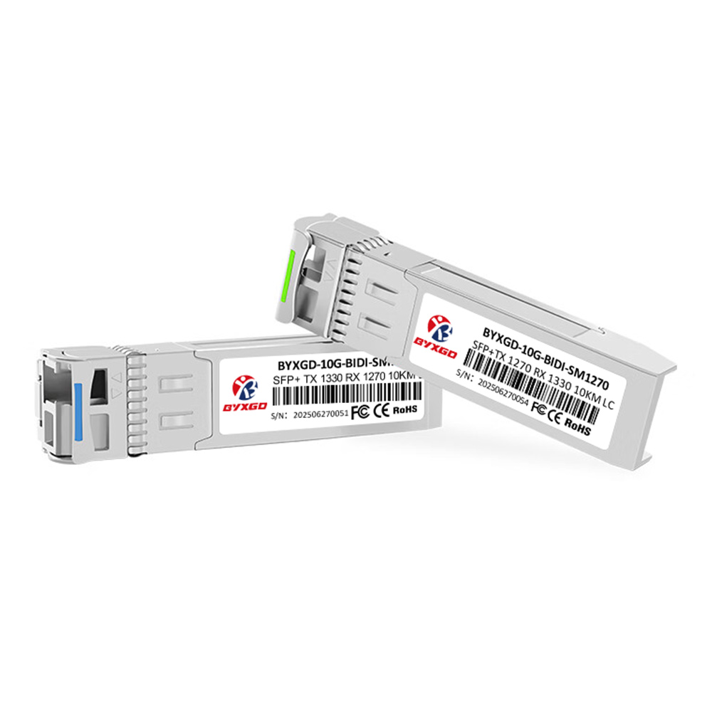 Compatible brands and model examples include: Juniper Networks: SFPP-10GE-BX10D-IT; HW: SFP-10G-BXD1; Ciena: XCVR-S10U33; Mikrotik: S+2332LC10D; Fortinet: FG-TRAN-SFP+LR. The 10GBASE-BX10-D module supports 10 km links over OS2 SMF-rated fiber with an LC simplex connector. The module will transmit a 1330 nm wavelength while receiving a 1270 nm wavelength over one strand of fiber, while the partner device will operate in the opposite direction for the wavelengths. Proper use of the complementary wavelengths in each direction of the link will allow full duplex BiDi capability and provide link performance stability in enterprise and service provider networks.